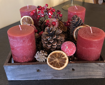 Je commence à rentrer dans le vif du sujet en créant ma couronne de l'avent ou plutôt mes quatre bougies représentant les quatre semaines avant Noël. La couleur rouge est de mise, avec une touche d’orangé (tranches d’orange que j'ai séchée). La première bougie sera allumée dimanche 27 novembre.